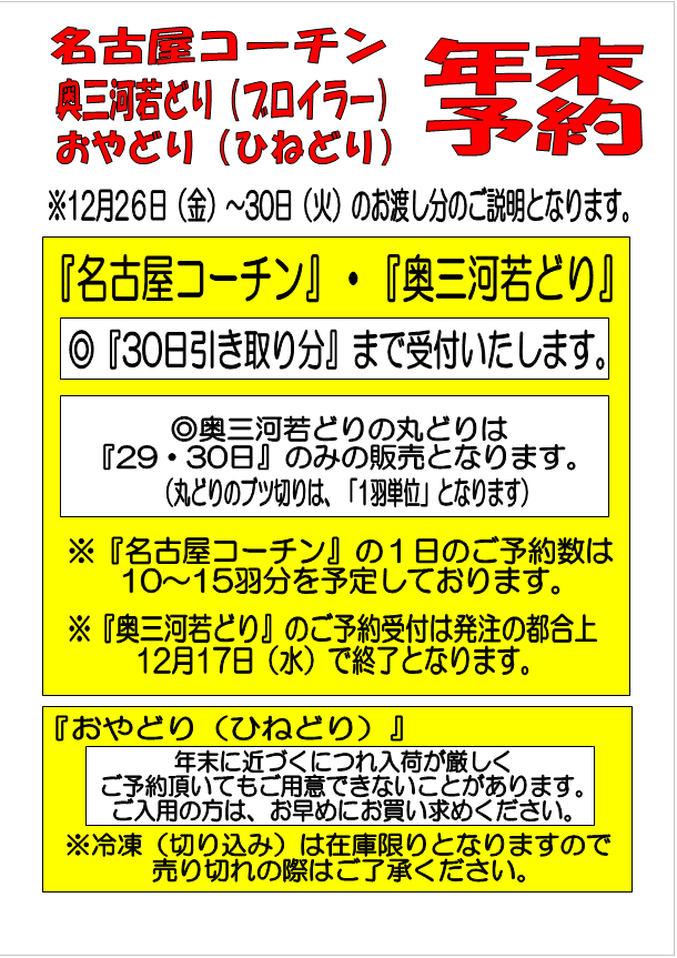 〇名古屋コーチン・奥三河若どりの年内ご予約