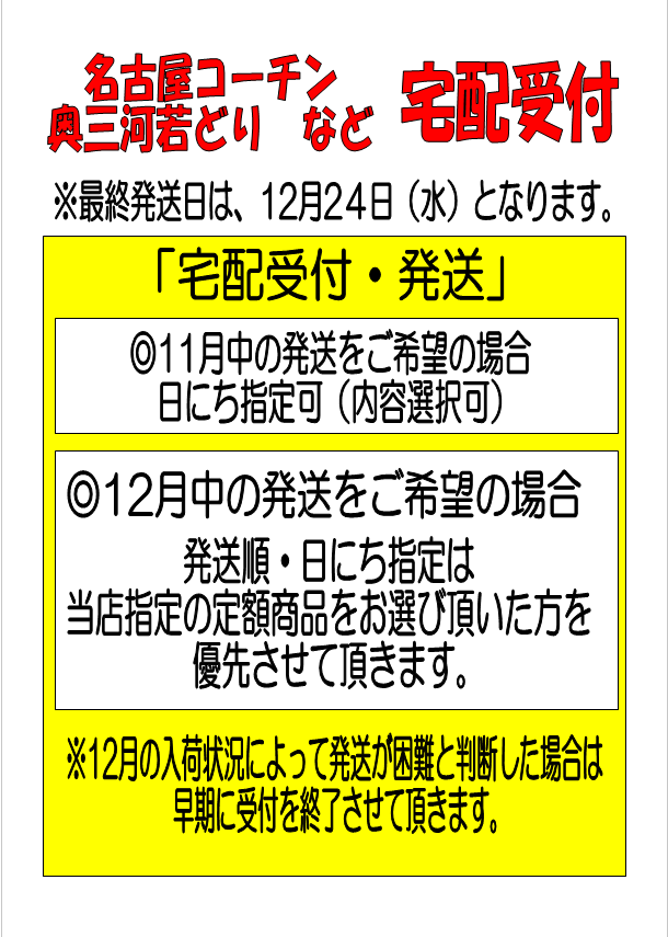 〇名古屋コーチン・奥三河若どりの年内宅配ご予約(全国発送)