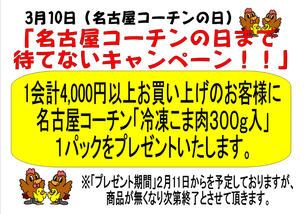 2月11日(水)から名古屋コーチン「冷凍こま肉」プレゼントキャンペーン開催!